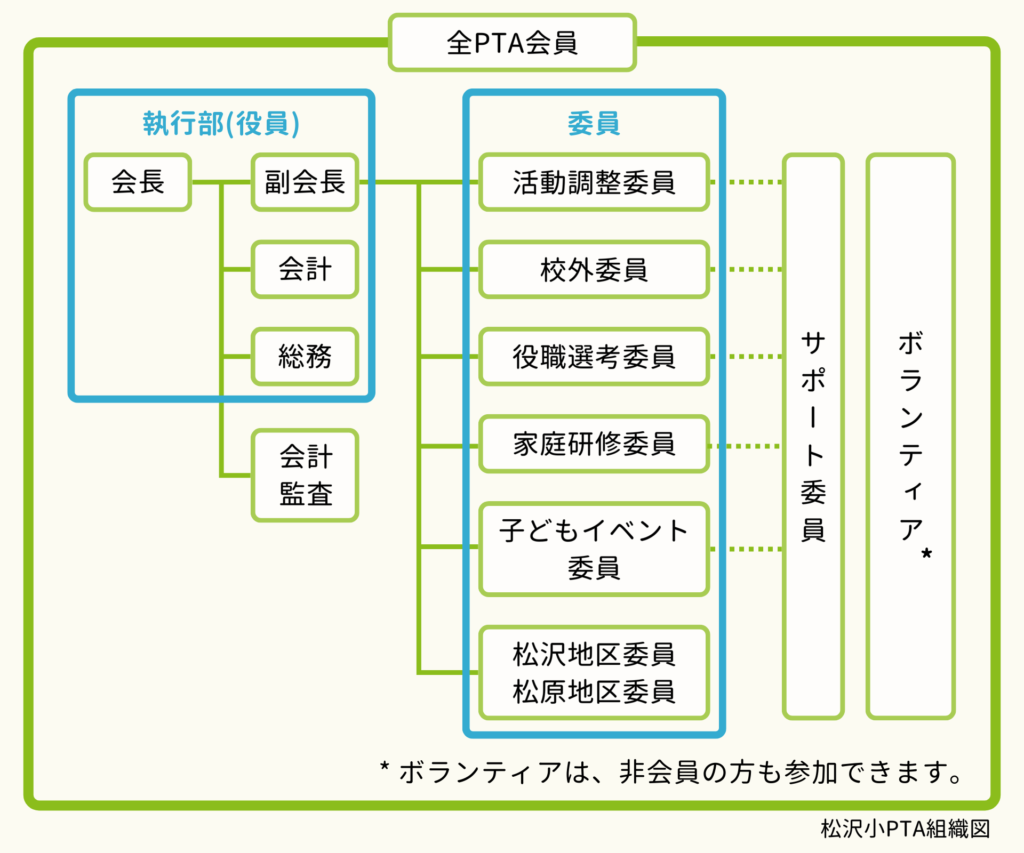 松沢小学校PTAでは、必要に応じて各家庭に役員・委員・地区委員・係などの役を担当していただいています。役員・委員・地区委員は秋の役職選考で選出し、係は必要となった際にその都度募集しています。