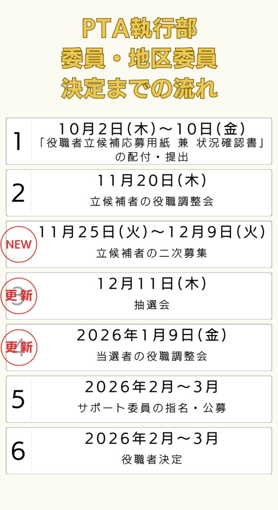 このページは令和8年度の役職選出に関する特設ページです。PTA活動の把握と立候補時の活動把握にお役立て下さい。